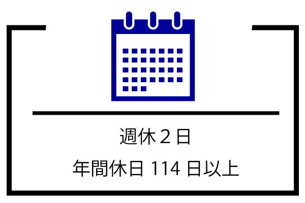 - 年間休日数 114日 週休2日制(日曜固定・祝日)/年次有給休暇 ※祝日がない週は基本水曜がお休みです。 誕生日休暇(1日)/ワークライフケア休暇(2日)