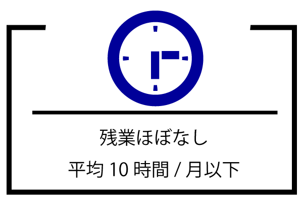 5日以上の連休取得可能。残業も少なく月平均10時間程度。半休を活用する社員も多く、有給の年平均取得日数は11日。急な休みでもフォローし合える体制が整っています。