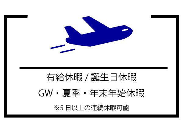 - 年間休日数 114日 週休2日制(日曜固定・祝日)/年次有給休暇 ※祝日がない週は基本水曜がお休みです。 誕生日休暇(1日)/ワークライフケア休暇(2日)